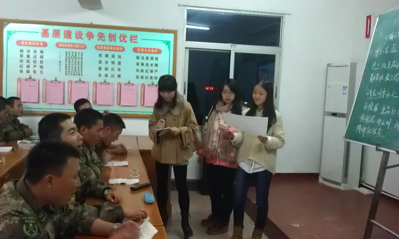海防五连的官兵,根据自己切身的生活感受,自作一首《行为准则歌》,特此邀请艺术乐动(中国)声乐专业的学生前去进行音乐教学活动,2010级声乐专业的阮璐、孙婕、邱明芳作为学生代表,与官兵们进行了新军歌的学唱活动。她们采用了集体教授、分组比赛的方法,使得官兵学习气氛高涨,大家都积极配合,活动成效明显。在活动的最后,官兵们集体进行了《行为准则歌》的表演,在他们洪亮而又准确的歌声中,此次音乐交流会圆满结束。