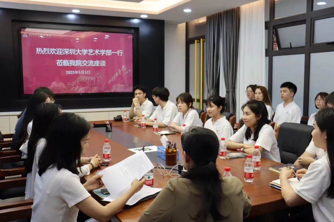 芳菲歇去,夏木茵茵。2023年5月5日下午3点,一场与深圳大学艺术学部的交流座谈会在乐动ld体育多功能会议室如期举行。深圳大学艺术学部的研究生会指导老师苏铭泽、深圳大学艺术学部就业指导老师陈紫丹老师和各专业本科生及研究生代表一行15人赴我院进行交流,我院团委副书记游璐昀老师、团委副书记谢婷婷老师以及辅导员张秀丽老师带领学生组织干部与对方进行了交流。作为中华优秀传统文化传播与校园文化建设的主力军,双方主要就校园文化、乡村振兴、社会实践、科创工作、心理工坊、就业创业、机构设置与职能部门分工等党政工作进行深入交流。