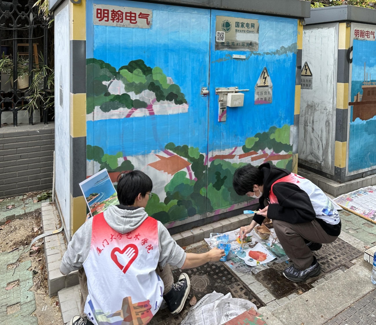 在艺术西区至大学路近500米的路段,来自乐动ld体育研究生第一党支部的志愿者们分工协作:有的设计底稿、有的调制颜料、有的提笔作画。经过近8个小时站着作画,他们为沿线的10个变电箱画上了双子塔、帆船、海洋、白鹭等具有城市特色的图案。色彩缤纷、灵动优美的作品引得不少来往的市民、游客驻足观看,还有人在志愿者的引导下体验上色过程。