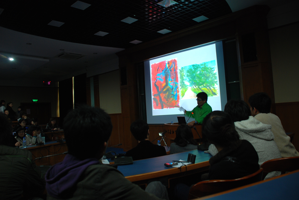 一开场郑博安教授便以“什么是抽象画?怎么欣赏抽象画?”为主题进行演讲,其风趣幽默的教学方式,把在场的师生带进了他的抽象艺术世界。他从文化角度简要分析了他眼中西方抽象艺术的差异。郑教授还向在场的师生展示了他珍藏多年的习作,且做了相关欣赏引导。他强调用色彩突出主题的绘画风格。在他的画中,总是一片色彩和笔触的狂欢,满怀炽热的激情令运动感的和仿佛旋转不停的笔触是那样粗厚有力,色彩的对比是那么单纯强烈。然而,在这种粗厚和单纯中却又充满了智慧和灵气。这种画面所造成的气氛效果表现出一种罕见的旺盛的生命力。像闪烁着熊熊的火焰,其强烈的个性和在形式上的独特追求,让在场的师生在欣赏画作时,无不为那激动人心的画面效果而感应,心灵为之震撼。