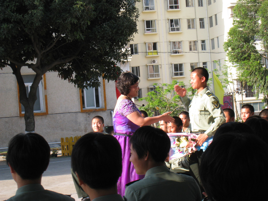 同学们首先参观了官兵们学习和生活的场所,然后演出正式开始。同学们自行携带录音机和麦克风在部队的篮球场进行了演出。尽管音响效果不尽如人意,但同学们都非常认真的表演,博得了官兵们的阵阵掌声。虽然场地不适合跳芭蕾舞,许乃琳同学仍然为官兵们奉献了一段芭蕾舞,长笛独奏《我心依旧》和萨克斯独奏《我只在乎你》将战士们带到了浪漫的爱情中,李捷的一曲《回家》让战士们在母亲节前夕想到了远在千