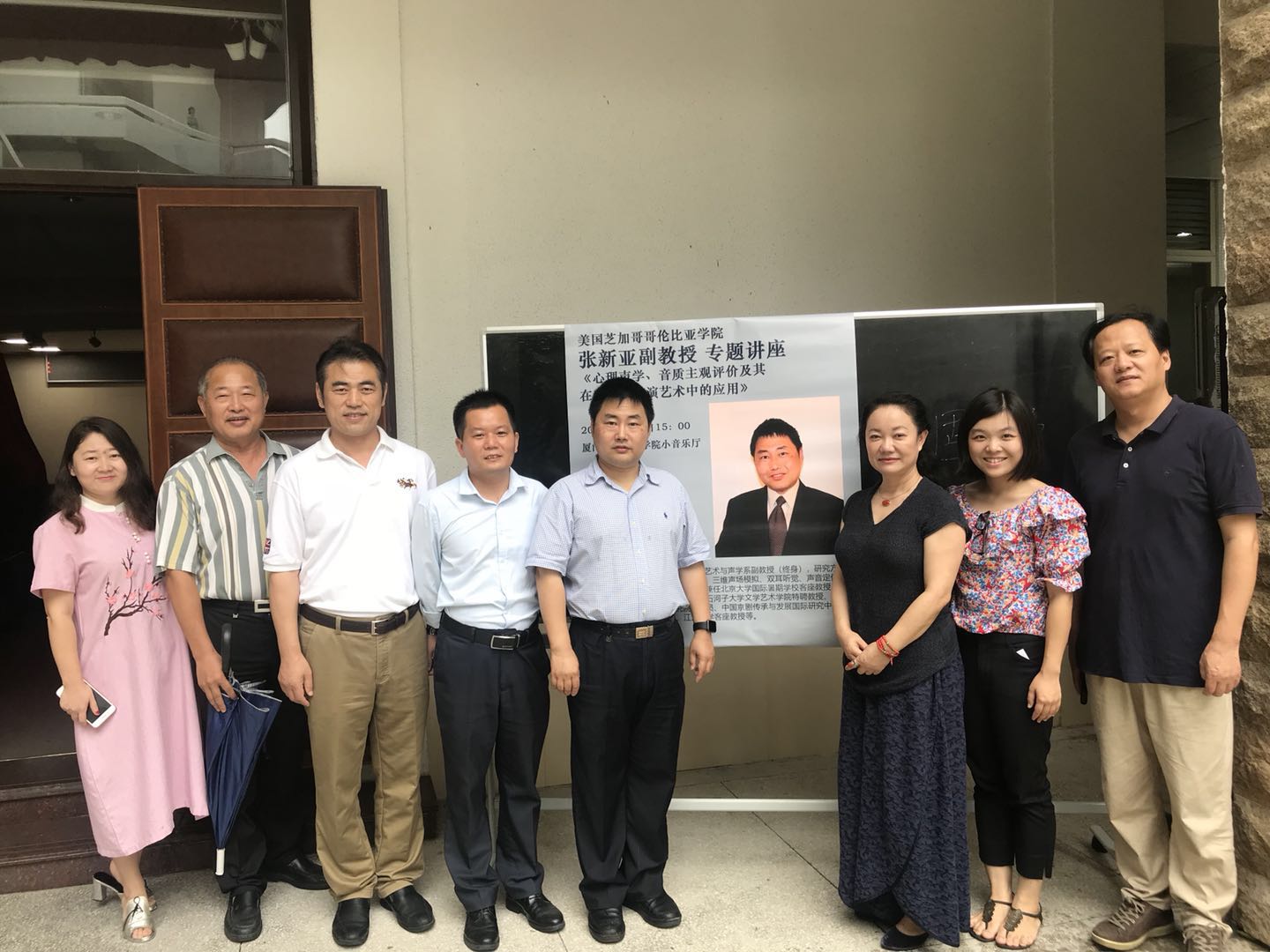2018年6月19日下午,艺术乐动(中国)小音乐厅迎来了一场高水平讲座,讲座由音乐系副主任段永纯主持,艺术乐动(中国)副院长赵艳芳、党委副书记邹江涛、音乐系主任陈言放、声乐教研室主任刘涛等领导和音乐系师生出席了讲座。讲座主讲人张新亚副教授是来自美国芝加哥哥伦比亚乐动(中国)音频艺术与声学系副教授。他的研究方向为心理声学、建筑声学、虚拟现实、三维声场模拟、双耳听觉、声音定位、媒体艺术、录音、人声与歌唱等。兼任北京大学国际暑期学校客座教授、石河子大学文学艺术乐动(中国)特聘教授、中国国家文化发展国际战略研究院研究员、中国京剧传承与发展国际研究中心研究员等。
