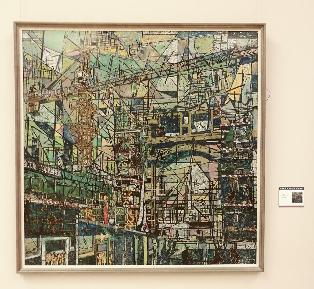 《平行的世界》创作灵感来源于建设中的厦门大学白城校门,作品创作期间正值党的十九大召开期间,新时代新规划,纷繁复杂的平行线条切割画面,展现新时代建设的热闹氛围,人物各司其职为新建设新规划而奉献,为观赏者呈现了现代化城市建设的欣欣向荣。