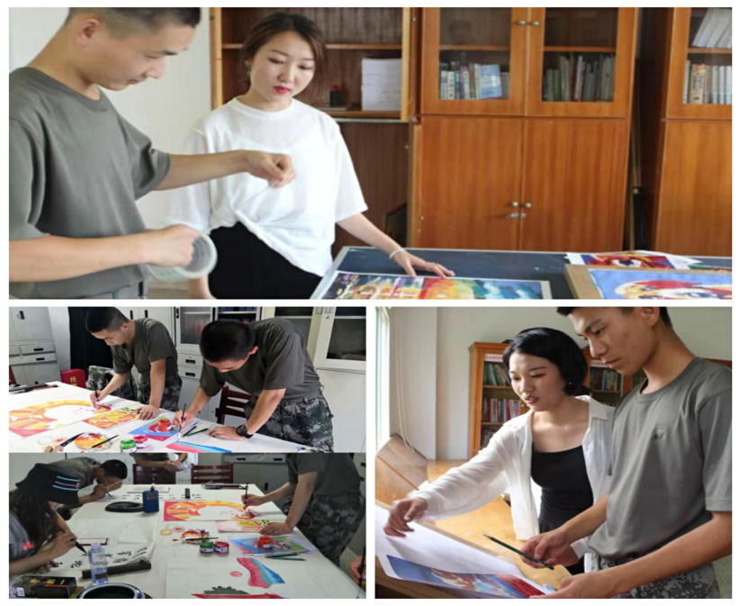 绘画课上,艺术乐动(中国)的同学们为部队官兵讲述了色彩搭配组合的基本原理,使他们成功绘出了一幅幅色调明朗的红色主题画作。