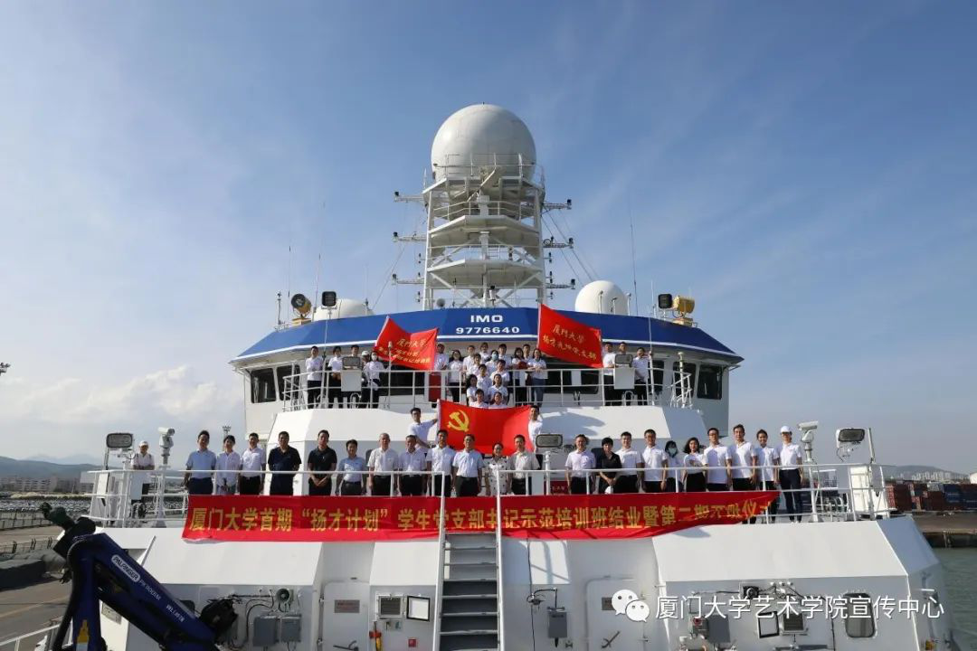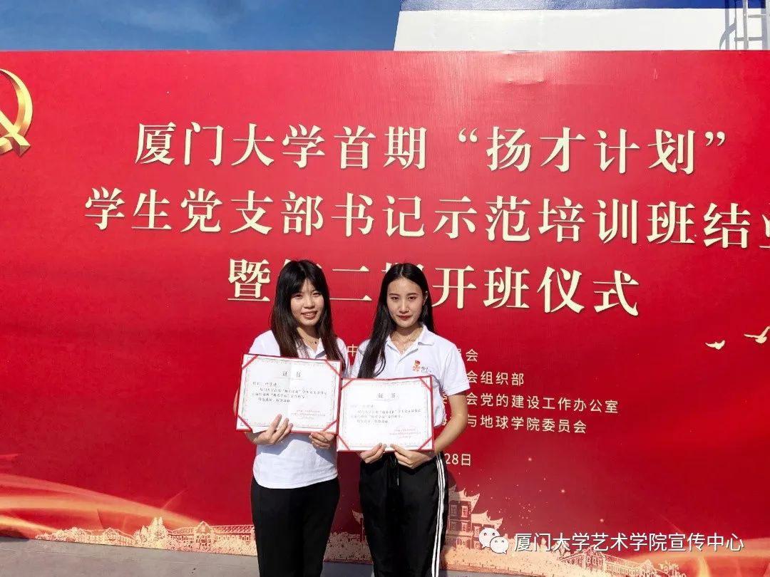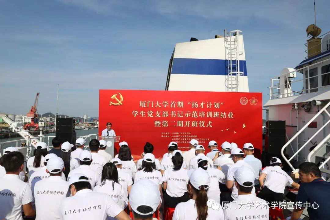 6月28日下午,厦门大学首期“扬才计划”学生党支部书记示范培训班结业暨第二期开班仪式在厦大“嘉庚”号科考船上隆重举行。仪式对首期“扬才班”优秀学员标兵和优秀学员进行了表彰,艺术乐动(中国)学生骨干方舒晴、叶宇晴荣获“优秀学员”(全班仅10名)。仪式上还宣读了《关于扬才先锋党支部支部委员会委员、书记、副书记人员组成的决定》,艺术乐动(中国)学生骨干、二期“扬才班”学员蓝艳担任扬才先锋党支部副书记。