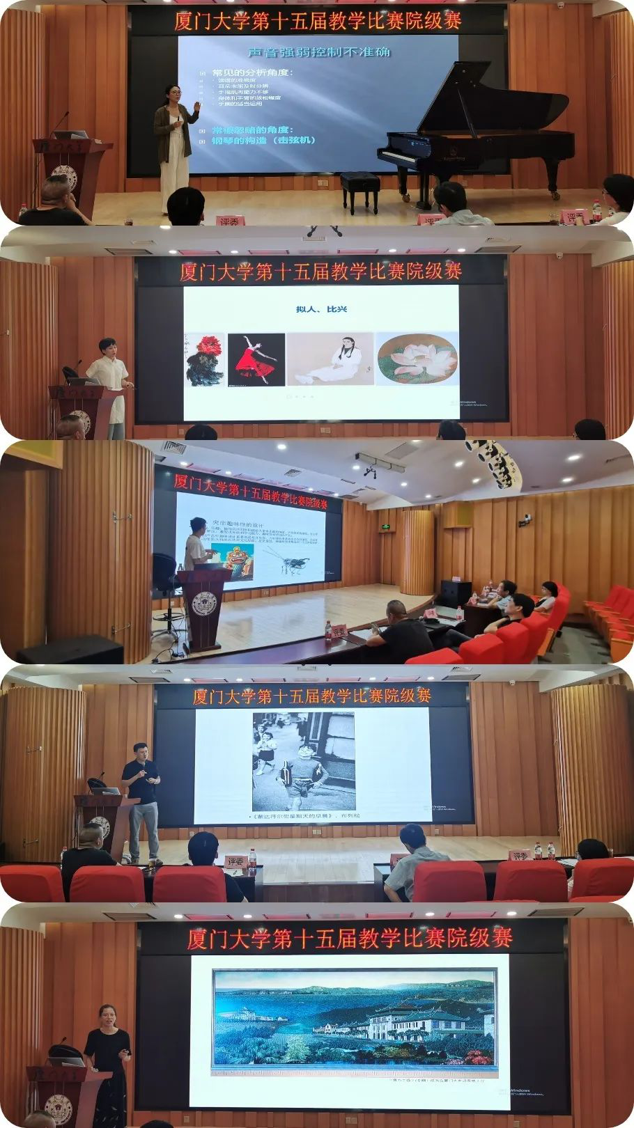 本次院赛经过各系发动,个人报名,共推荐五位青年教师参赛,分别是音乐系李国超,美术系陈晓娟、张玉惠、黄巍巍,设计系孙超。李国超介绍了不同时期音乐风格和钢琴构造的演变,通过播放视频、现场弹奏示范等方式展示钢琴演奏中力度大小、声音强弱的技术问题;陈晓娟引导学生从诗词文学的意境中探寻白描写生的观察方法;孙超运用大量的摄影作品案例,帮助学生认识相机的构造,阐述相机的使用的方法;黄巍巍围绕文创产品的分类和设计方法,通过引用案例,深入浅出地进行剖析讲解;张玉惠通过介绍漆画及其创作方法和历史,为大家生动展示了漆画第一堂课。