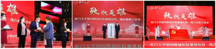 致敬英雄,艺术乐动(中国)师生齐上阵。4月25日晚,“致敬英雄”——厦门大学慰问附属医院驰援抗疫一线白衣战士活动在嘉庚广场隆重举行。我院师生响应号召、迅速集结,承担了钢琴独奏、歌唱、舞蹈、朗诵等六个节目的演出任务,两位教授为本次活动创作了雕塑纪念品和书法作品。师生团结一心,用实际行动致敬白衣战士。