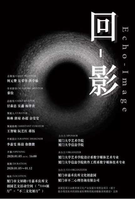 本次展览由何元赞、吴荣华 、洪学敏担任总策划;秦俭担任学术指导;甘森忠 、吴鑫 、杨律青担任总指导。展览作品指导老师为林琳、唐琼、朱红、孙超、马文、佘莹莹。林琳、唐琼、孙超、佘莹莹担任策展人;王智敏、阮艺红、蒋钰担任策展助理;李嘉雯、陈晨、詹薇薇完成海报平面设计。“回-影Echo-Image”展览于2020年1月5 日16:00开展。由乐动ld体育和信息乐动(中国)主办,乐动ld体育设计系数字媒体艺术专业,厦门大学信息乐动(中国)软件工程系数字媒体技术专业承办,厦门市嘉禾良库文化创意园和厦门市不二心理咨询有限公司协办。该展览项目由教育部文化产业发展专项资金项目《基于混合现实技术的国际虚拟博物馆流动镜像系统建设》支持。
