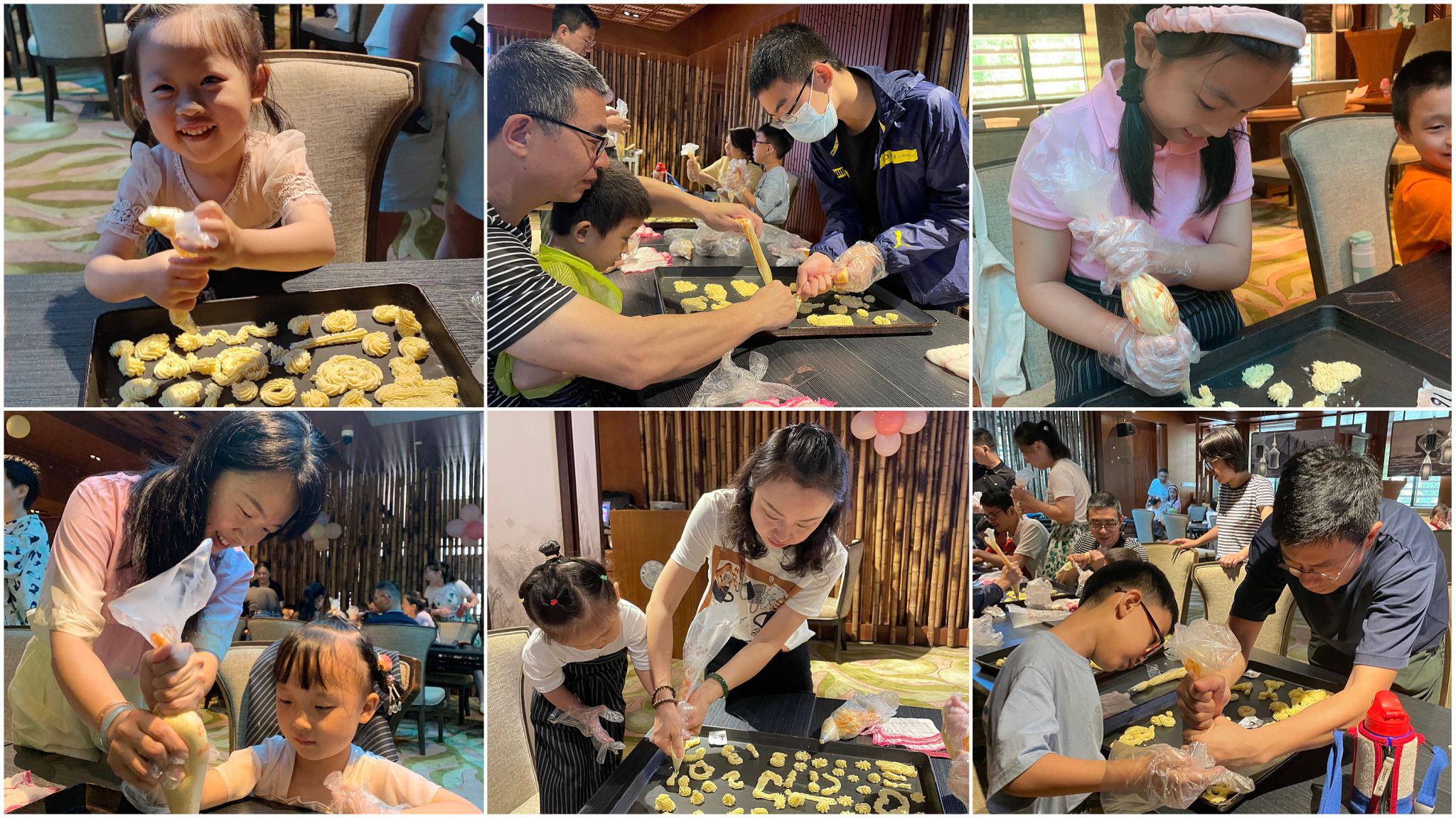活动中,孩子和家长们认真地聆听烘焙老师的现场讲解、示范。之后孩子们在爸爸妈妈的协助下充分发挥自己的创意,用奶油制作出各种形状的曲奇饼,有音符、数字、汽车、坦克……别看这看是简单的捏花,可是很考验孩子们的耐心。随后还有甜甜圈的制作,活动现场洋溢着节日的气息,热闹非凡。