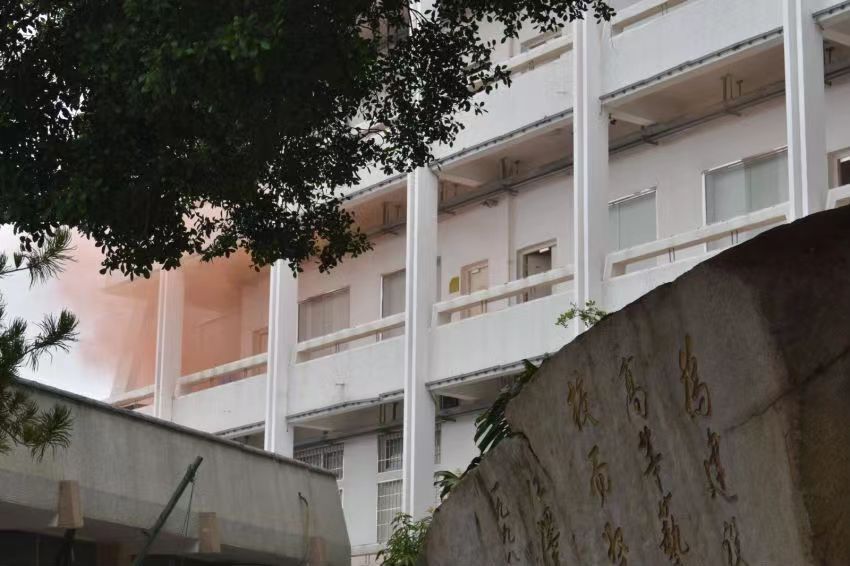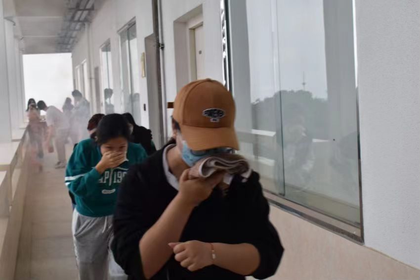 抗灾救火,刻不容缓。10:05,院办公室主任根据现场情况立即“拨打”119“报警”,并向分管安全副院长通报火情。10:06, F楼老师和其他教职员工也赶到现场稳定军心,分别沿楼内各个疏散楼梯引导不同楼层的师生手持湿毛巾弯腰低姿,一手扶墙、一手捂住口鼻往一楼逃生。安全员在疏散楼梯门口大声提示:“请大家不要惊慌,就近寻找安全出口,有序疏散!”