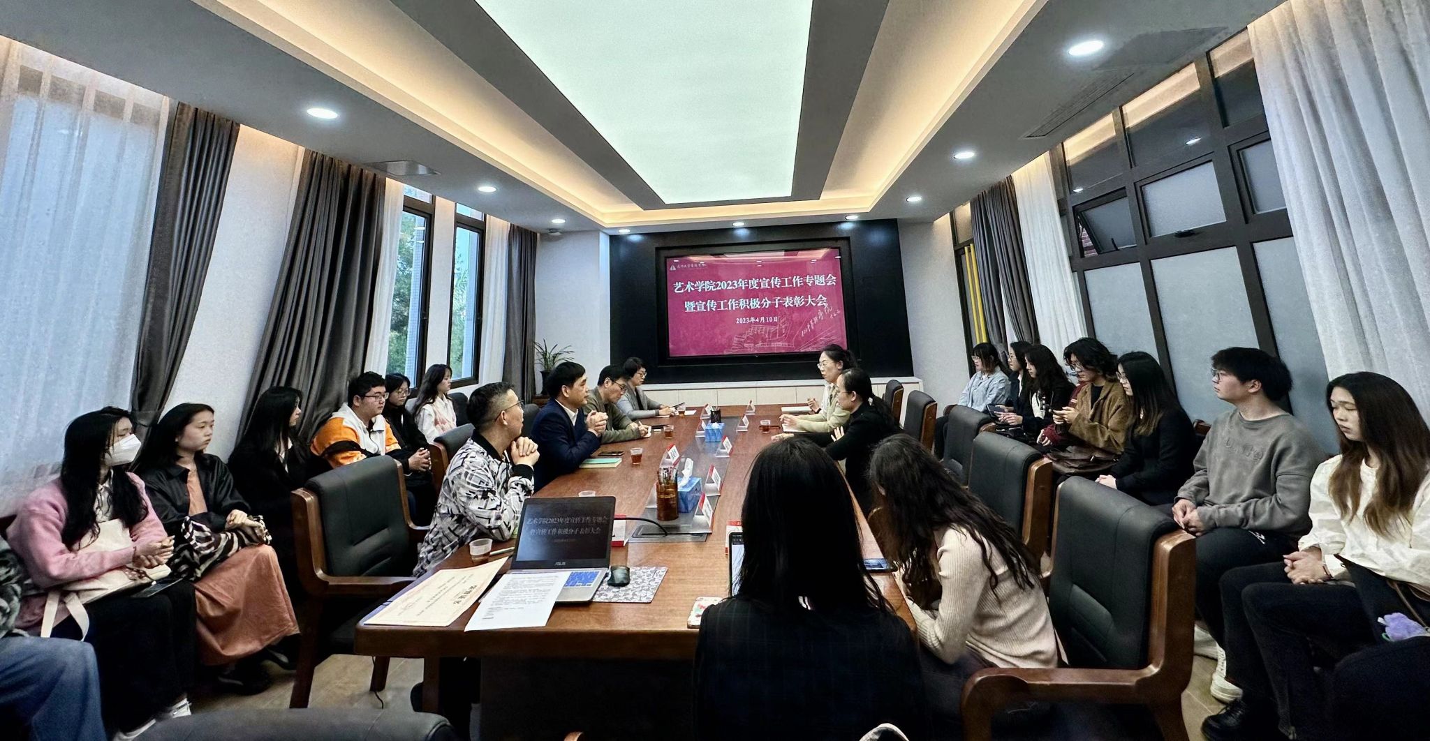 为进一步学习贯彻习近平新时代中国特色社会主义思想和党的二十大精神,深入领会习近平关于宣传思想工作的重要论述,推进乐动(中国)宣传工作取得更好实效,4月10日,乐动ld体育召开2023年度宣传工作专题会暨2022年宣传工作积极分子表彰大会,院党委书记张必华,院长刘赦,院党委副书记王艺宏,院团委书记,党务秘书,院部、美术系、音乐系宣传工作联络员,学生宣传中心,网络文化工作室骨干成员等30余人出席会议。会议由王艺宏主持。