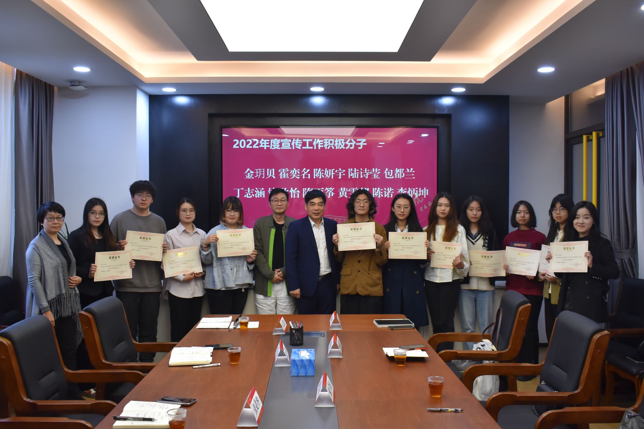 会议表彰了2022年宣传工作积极分子,张必华、刘赦为获奖颁发奖状并合影。王艺宏对获奖同学表示感谢,她表示,过去的一年,同学们在担当中历练,在尽责中成长,向乐动(中国)师生交出了一份优异的答卷。