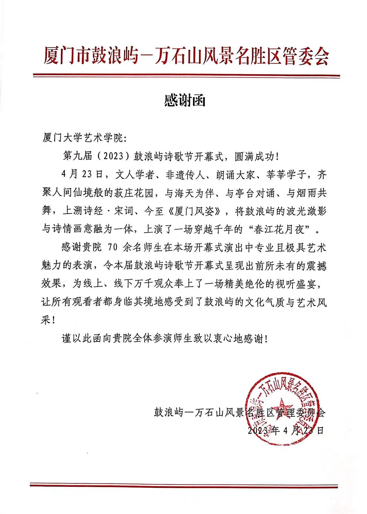 演出结束后,诗歌节主办方鼓浪屿管委会和开幕式导演刘雅嘉表扬了艺术乐动(中国)师生的精彩表演,并且特别感谢杨绿荫、黄飞、李佳璇、黄体文、李鑫、赵亮几位老师对本次诗歌节开幕式的大力支持。“鼓浪屿诗歌节开幕式”演出的圆满结束,让大家看到了厦大严谨的学风,也感受到了艺术乐动(中国)同学们的高水准。