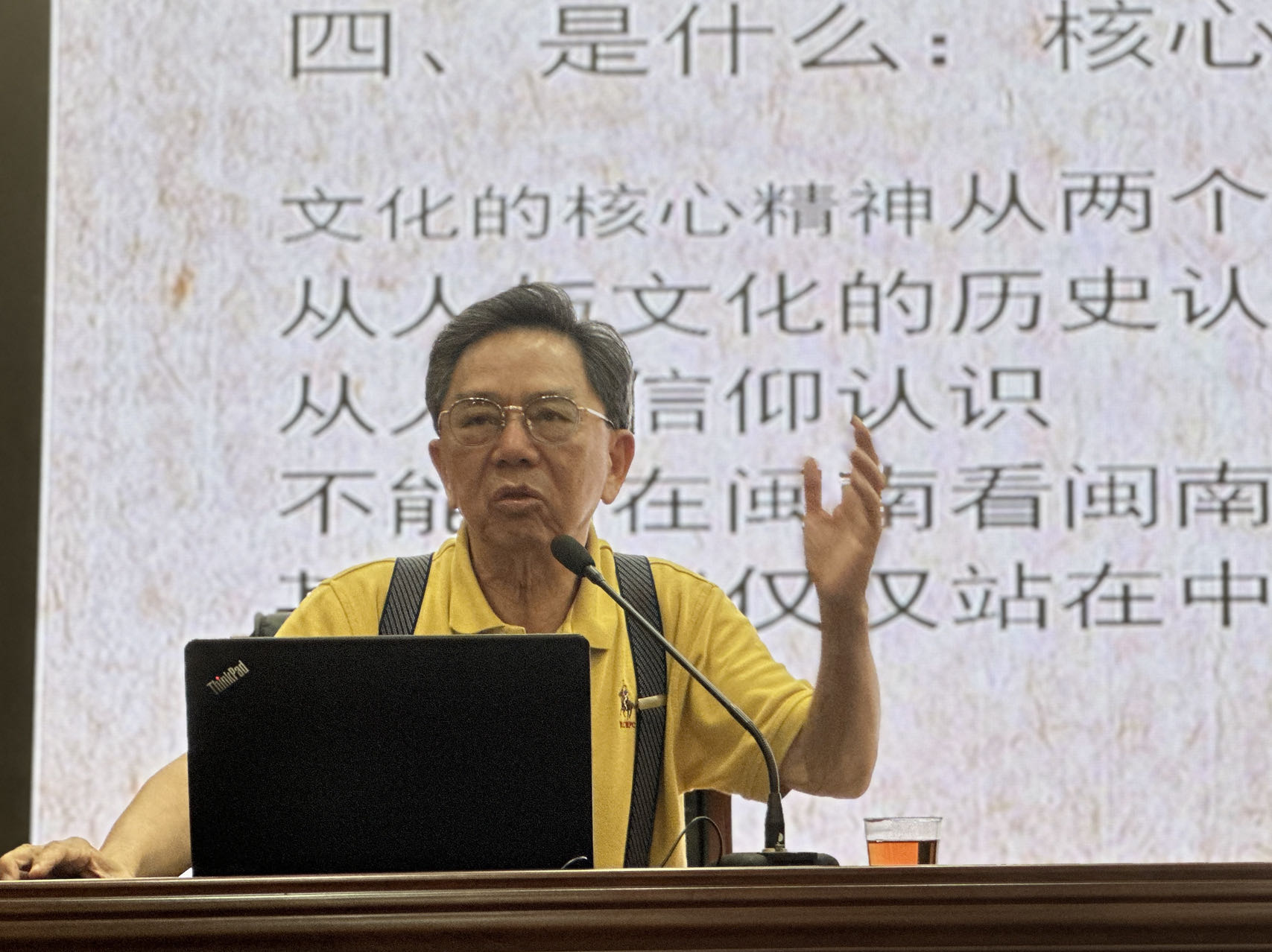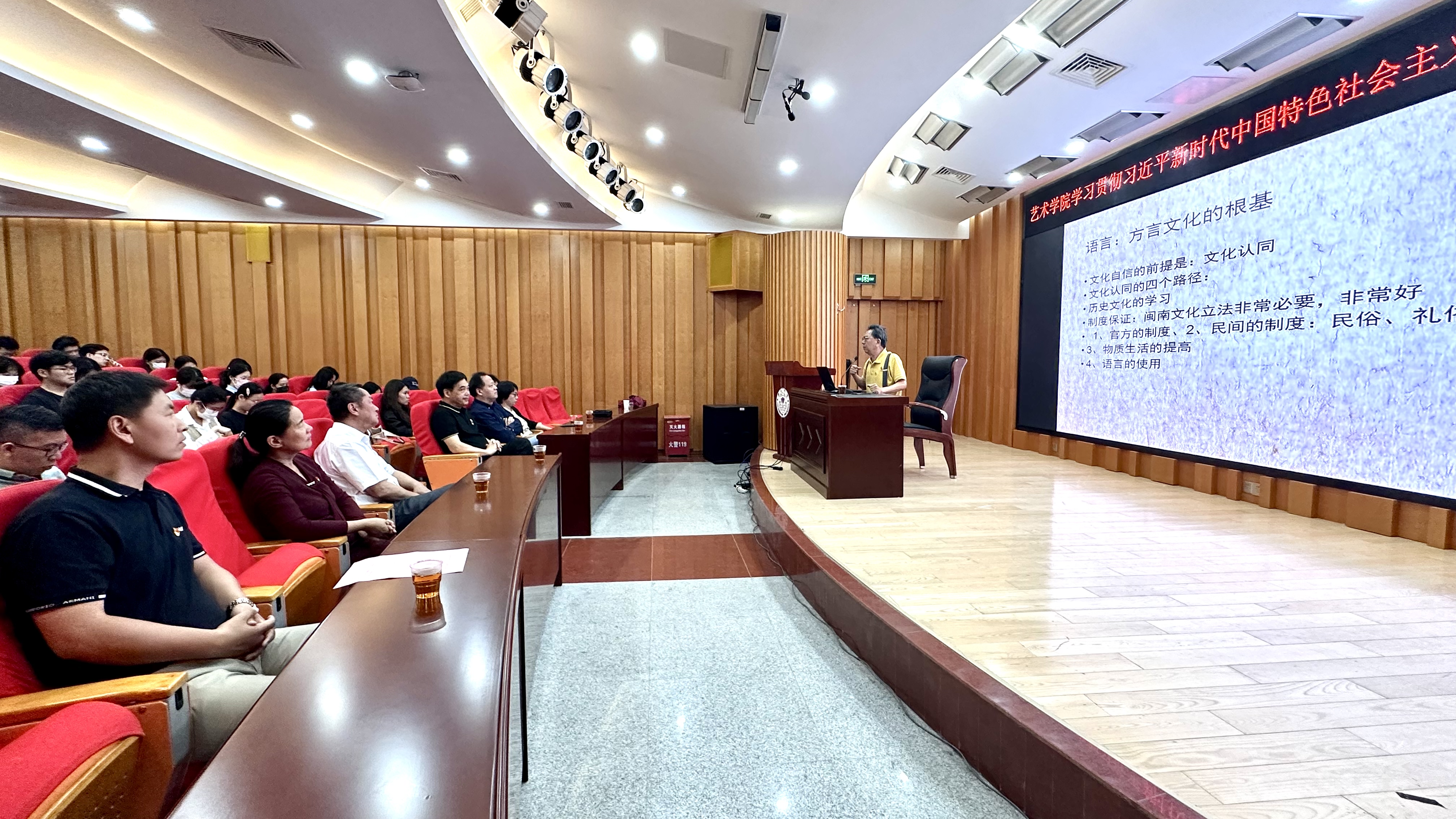 陈耕教授围绕“文化自信从了解脚下土地文化开始”,为广大党员详细介绍了闽南文化三个基础和六个问题的具体内涵。“中华文化博大精深,体现在缤纷的民族文化、地方文化上,了解自己脚下土地文化,才能真正树立起文化自信”,陈耕结合闽南文化实例,指出语言、文化理念、文化生命规律是学习文化的三个基础,以“在哪里”“哪里来”“有什么”“是什么”“怎么样”“去哪里”等六个了解文化的问题为纲,详细介绍了“各美其美,美人之美,美美与共,天下大同”的文化内涵及文化自觉,深入讲述闽南文化从史前、孕育、形成、鼎盛、成熟到近代转型与发展的历史脉络,分析了闽南文化的精神和基本内涵。陈耕教授还解读了习近平总书记关于文化自信的重要论述,强调了文化自信的重要时代意义。整场讲座氛围认真而不失活泼,现场掌声不断。