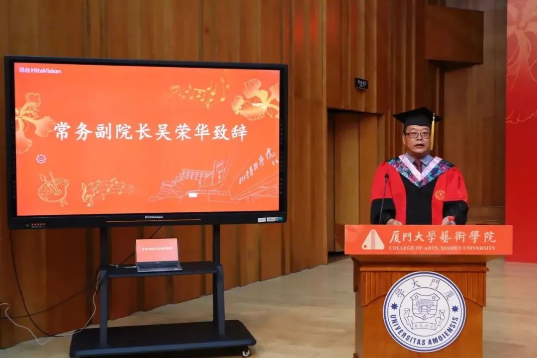院党委书记张必华主持典礼,毕业典礼在庄严的国歌中拉开序幕,在毕业生们的热烈欢迎中,艺术乐动(中国)常务副院长吴荣华教授致辞。艺海无涯,秉承师训,他希望毕业生们在以后的学习和工作中能答好4道题:坚定方向明大局,答好理想信念这道基础题;撸起袖子加油干,答好拼博奋斗这道关键题;明德致远立格局,答好崇德尚艺这道必答题;精益求精练苦功,答好工匠精神这道加分题。