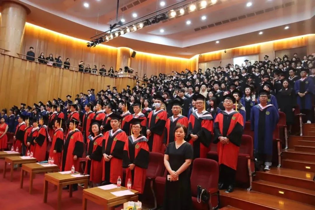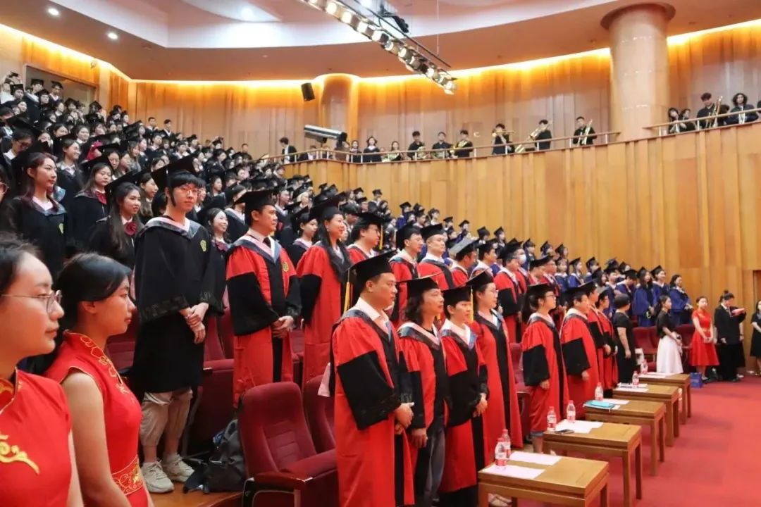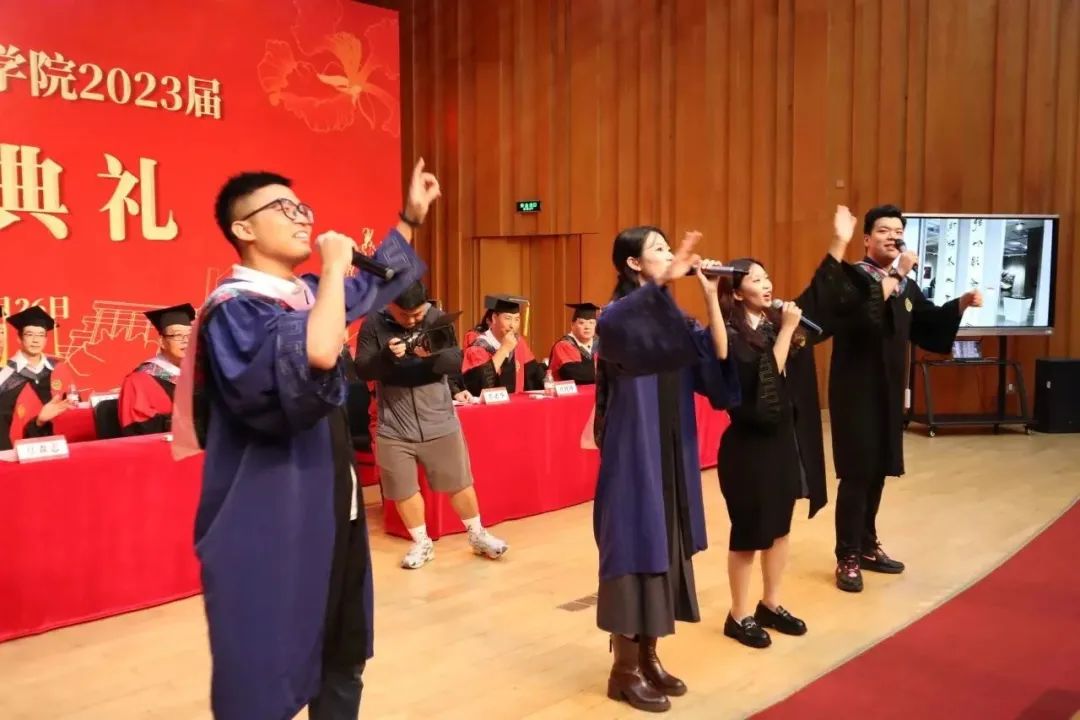 “又到凤凰花都开放的时候……”座位席里传出天籁之音,音乐系本硕毕业生陈龙慧、付昌坤、段欣欣、徐江涛领唱《凤凰花开的路口》《再见》,毕业生们摇臂欢呼“我爱你,再见”,将典礼气氛推向高潮。