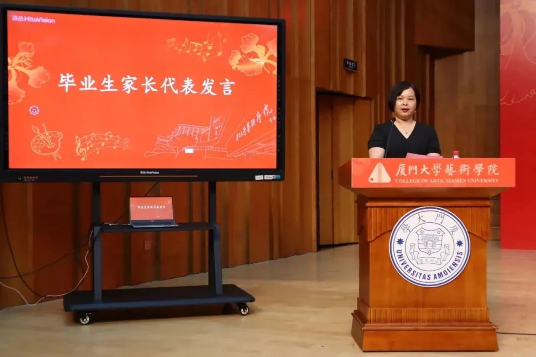 音乐系本科生沈斯涵同学的母亲陈艺珍女士作为家长代表发言。陈女士对乐动(中国)各位老师的悉心指导与培养表达感谢,对同学们顺利毕业表示由衷的祝福。作为长辈,她希望毕业生们用真心感受生活,在顺境中趁势而为,在逆境中破浪前行。