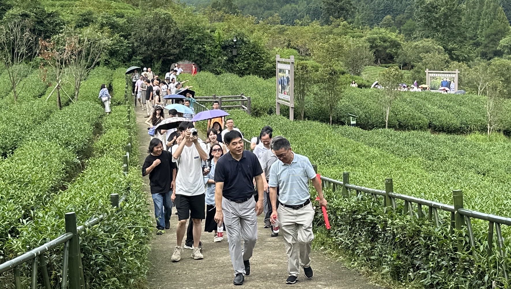 走进燕子窠千亩生态茶园的田间地头,满眼青翠,茶香芬芳,工作人员正在向师生党员介绍“茶科技”这个助力茶产业升级、茶农增收的新密码:大豆和油菜套种在茶树间,不用化肥又能防虫;5G、物联网等科技手段广泛应用于茶山……