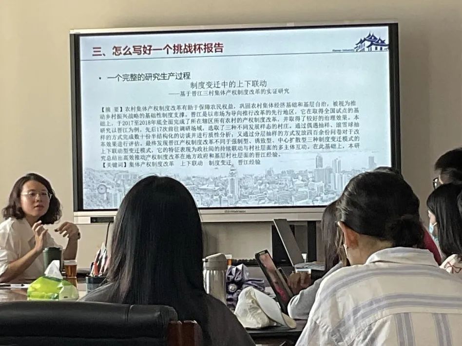 首先,有着两年挑战杯带队经验的林雪霏老师介绍了何为挑战杯--即挑战杯竞赛的内涵,内容与流程,全面展现了挑战杯赛事的含金量与竞争难度,帮助学生们对挑战杯有了全面而清晰的认知。