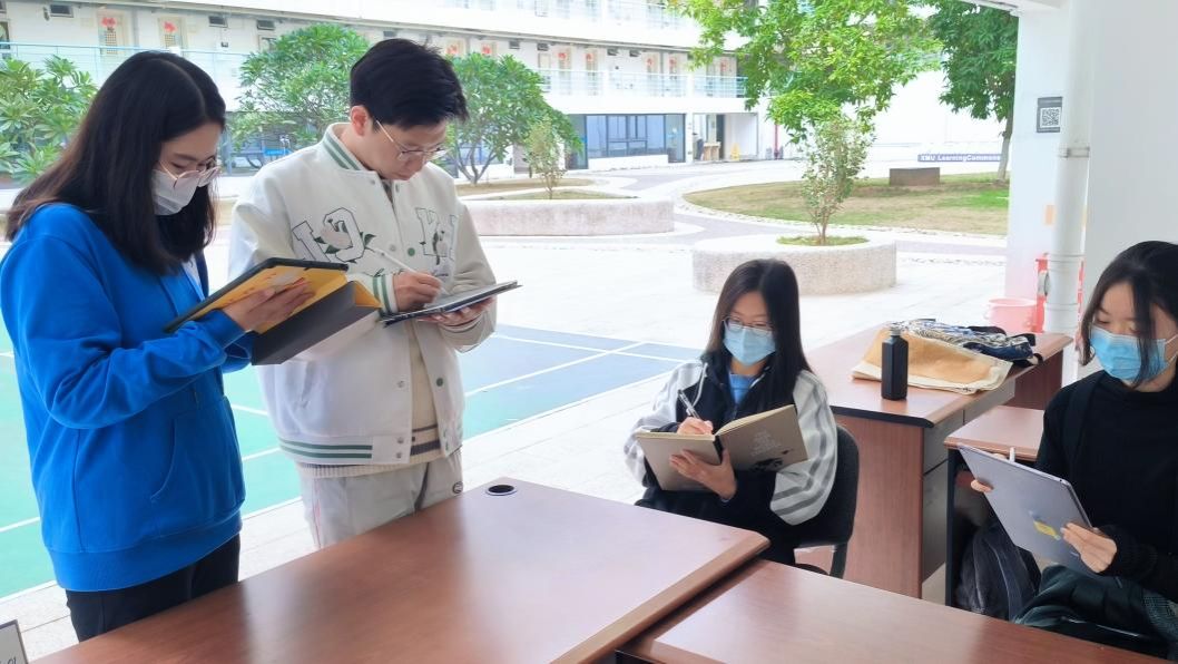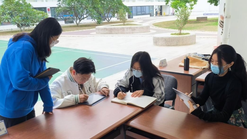 侯铭博、杨培植、林芳柔、邓恬霖同学进行绘画创作切磋