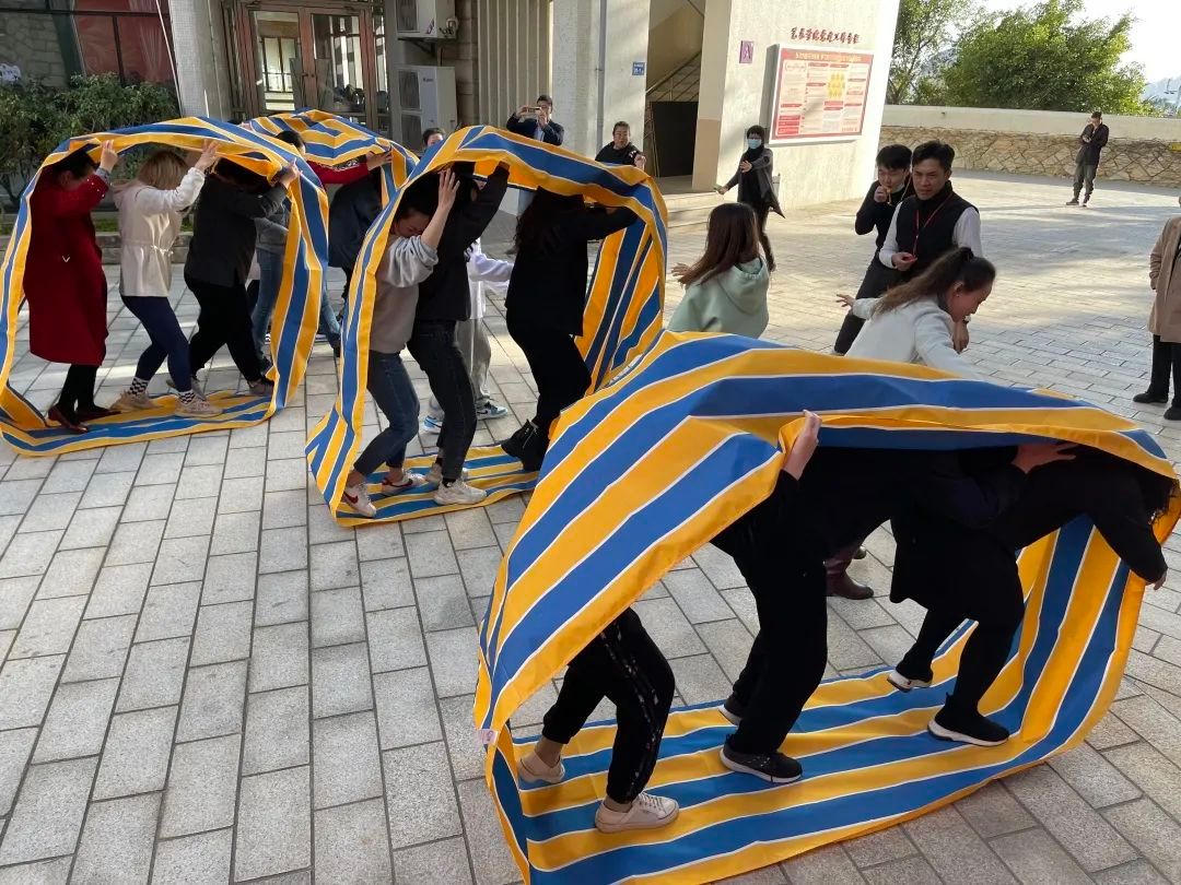 开场戏是“高山流水”,7人一组传递乒乓,培养团队精神和默契合作。