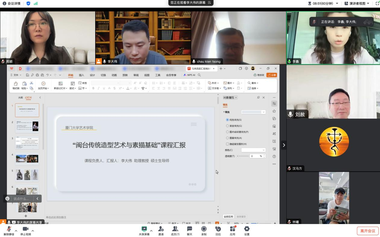 “闽台”课程的负责人,厦门大学艺术学的李大伟教授,主持了本次会议,并对课程进行了汇报。同时,“闽台”课程思政合作导师,来自厦门大学教育研究院的周颖,以及马来西亚课程合作联系人李鑫老师,还有课程课题组的其他成员——乐动ld体育美术系主任方广智教授、油画教研室主任林曦副教授和雕塑专业教师黄巍巍老师——也出席了会议。